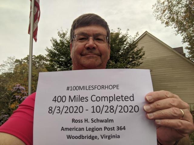 Ross H. Schwalm completed his stretch goal of 400 miles. Next up is Marine Corps/Desert Storm 218 miles in 43 days starting on Jan. 17, 2021, in honor of the 30th anniversary of that victory.