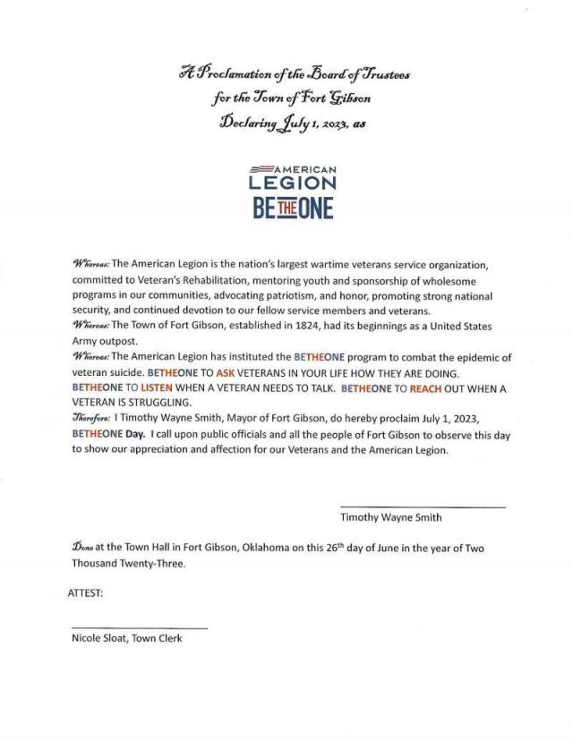 On June 26, 2023, at 6 p.m. at a regular town hall meeting, the mayor and city council members put forth a proclamation that July 1 of each year would be known in the Town of Fort Gibson as Be the One Day, in following with the town's history and tradition of coming together for people in need and veterans alike. The Town Council voted the proclamation in unanimously. Following a reading of the proclamation by Mayor Tim Smith, a photo with over a dozen members of the local American Legion Post 20, Sons of The American Legion and Axillary members was taken with the council. The Town of Fort Gibson and its citizens have always and continue to show their support for the veterans of the Armed Forces of the United States. It does not matter if it's a BBQ sale, a dinner, a festival, bingo or getting behind an American Legion push to help end veteran suicide -the town and its leaders show their support.