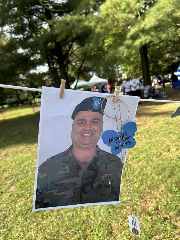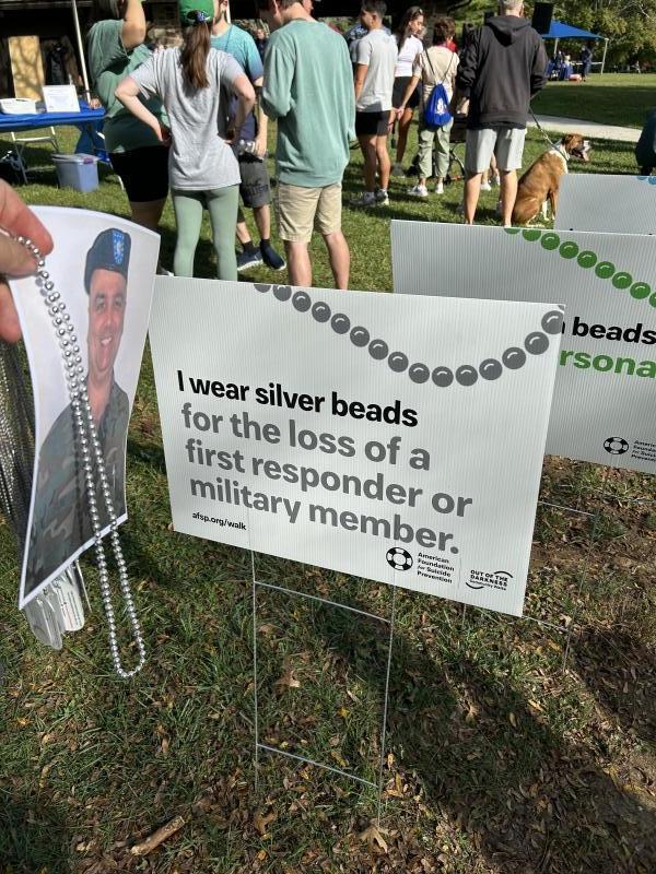 On Saturday, Sept. 27, 2025, I participated in the Walk from the Darkness sponsored by the American Foundation for Suicide Prevention in Hamilton, N.J. Instead of walking I decided to march the 2 miles. I walked specifically for a post member we lost and hung his picture in the Butterfly Garden. I wore my Legion cap and a custom Be the One shirt for this event. The post had dog tags printed with the Be the One information and link on it along with the post information. Additionally, the Dial 988 Option 1 pamphlets were distributed, and I spoke to many people about the training. Rise Up Counseling wants all their employees to take the training. Turns out the rep I spoke to was a Columbia University grad. I was even able to do some Buddy Checks along the way.