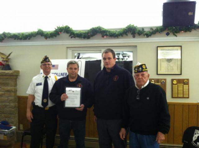 Post 288 Commander Dennis Lorberger and Assistant Chaplain Jim Lee present Cedarburg Fire Department Assistant Chief Vahsholtz and Park Board President Joey Hintz with a plaque of appreciation for their support in setup and preparations for the post's annual holiday event. The Cedarburg FD has been a staunch supporter of the Peter Wollner post, and all of the firefighters embody the spirit of community professionals.