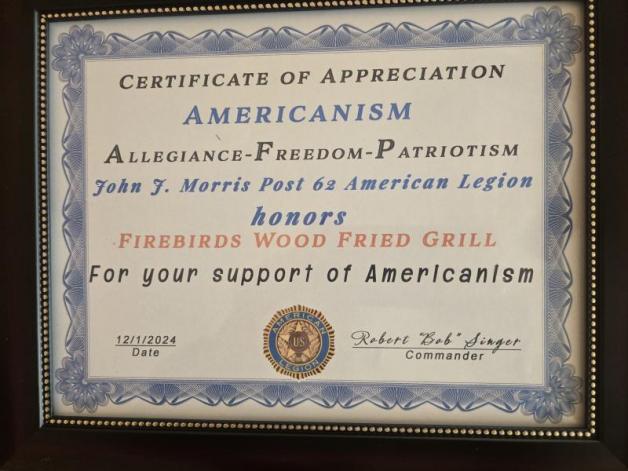 John J. Morris Post 62 (Peoria, Ariz.) honored Firebirds Wood Fired Grill with our Americanism Award for December. The top steakhouse in our city is always willing to support the community. Eric Brockway, general manager, leads by example and supports our military and veterans. On Veterans Day you are welcome to a top-notch steak, not offered only a limited low-end menu to veterans for free. They support the community with gift cards for events. It is great when a community business is supportive of their surrounding community. Thank you, Firebirds!
