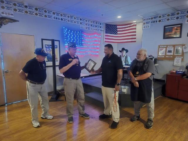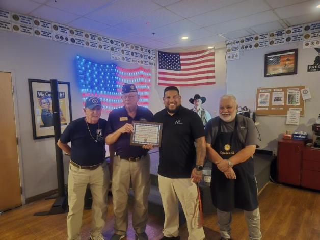 Each month John J. Morris Post 62 (Peoria, Ariz.) honors the Peoria business of the month for their support of veterans. This month we honored veteran-owned Next Level Trash and Property Maintenance with the Americanism Award. It is great to honor a small business with this award! Last year they gave us a great deal to help clean up the mess after several trees and even more branches went down in a couple bad storms. Over 10 trailer loads of debris were hauled away with several post members trimming the damages and working for days to clean up the post. Without Carlos' generosity and support, the work would have been overwhelming. At the presentation at the post Carlos was recognized with a standing ovation from all in attendance! Thank you to Next Level and all small businesses that make our country great!