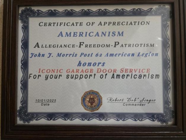 On Oct. 1, John J. Morris Post 62 (Peoria, Ariz.) honored Iconic Garage Door Services with the Americanism Award. The award is for the Peoria Business of the Month. They do great work and offer not only a veteran discount but also a senior discount. Their installers are great people with careful and courteous service. When we present the award monthly, the whole social quarters honor top businesses and are always looking for business cards for future reference. A salute to Iconic for great service to our community.