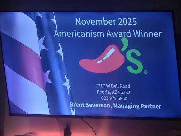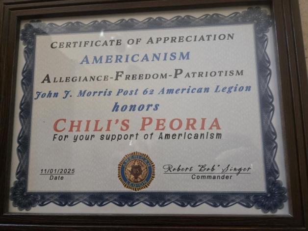 On Nov. 2, John J. Morris Post 62 (Peoria, Ariz.) presented their Americanism award to Chili's on Bell Road in Peoria. The restaurant does not just do a big Veterans Day event - they provide year-round veteran discounts on meals. The store also donated gift cards to the post for members to be honored for going above and beyond for the post. This award is presented monthly to the Peoria business of the month. It is great to see stores even with management turnover continue to support the veteran community. Thank you, Chili's!