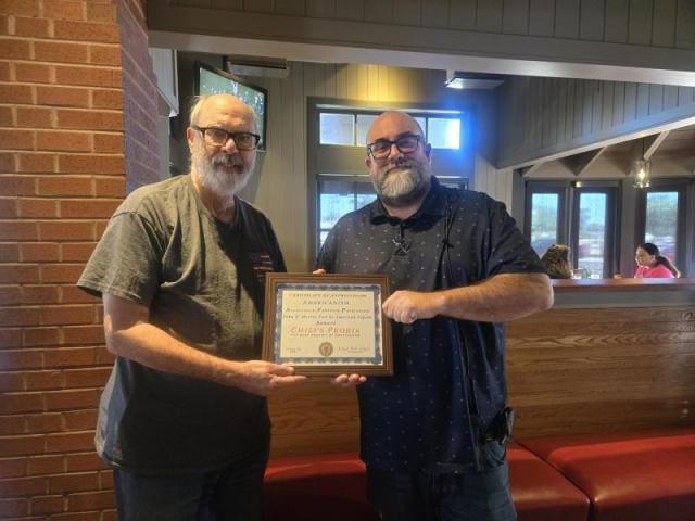 Publicity Chairman/Historian Dwight Amery presents the plaque to Dan Cunius, a manager at Chili's.