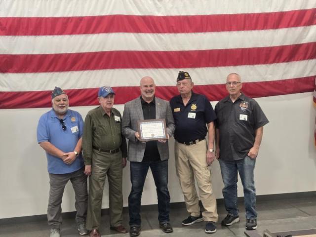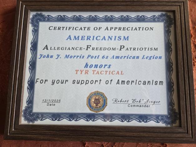 On Dec. 4, John J. Morris Post 61 (Peoria, Ariz.) presented their Americanism Award to Tyr Tactical, the largest private employer in Peoria. The award is for the Peoria Business of the Month. They make safety gear for first responders and military personnel. Jason Beck, the owner, has been a member of Post 62 for several years. He is a Marine, having served our country. Started as a very small company in 2001, it has grown to be not only nationwide but also internationally, especially in Europe. We salute Jason for living the American dream. Thank you for protecting those who protect us.