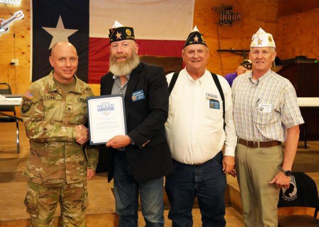 Lund was presented with a certificate by District Commander Eric Mayer, joined by Post Commander Randal Remaley of Sesquicentennial Post 592 and Department of Texas Commander Richard Huntley.