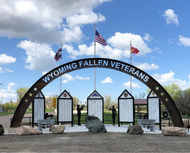 The memorial consists of a 16’ arch with its title, “Wyoming Fallen Veterans.” There are currently 1,560 Wyoming veterans’ names listed on five 4’x6’ panels – veterans who served on behalf of the United States and died in a combat zone from the Spanish-American War through the post-9/11 global war on terrorism. On three flagpoles overlooking the arch fly the American flag, the Wyoming state flag and the Gold Star Family flag. There are four steel silhouettes depicting a female soldier saluting, a bugler, a Gold Star mother and child, and the Battlefield Cross.