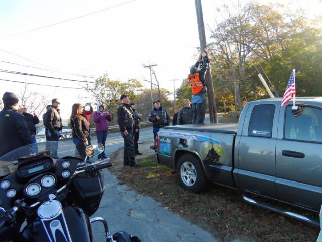 During a brief placing of a memorial plaque ceremony at the spot where a fellow veteran died in a horrific motorcycle accident on Oct. 16, 2016; this photo was taken of the posting. If you look closely you will see a resemblance of the six members of South Shore Hogs to which John Edwards was a member, and the six servicemen raising the flag at Iwo Jima. The telephone pole and the flagpole are directly in line with each other. A subliminal message from John to continue to support our veterans even after his death? You form your own opinions.