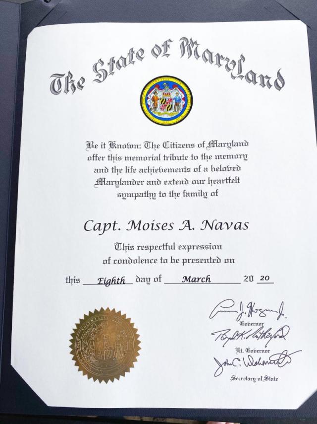 Capt. Navas was a beloved husband, father and MARSOC Marine Raider leader. He fell fighting an ISIL cell in Iraq along with Marine Sgt. Pongo of San Diego. Marks had the governor's citation delivered via the U.S. Postal Service as the family had relocated to North Carolina. He had also called Sen. Thom Tillis’ office (NC) in Washington DC requesting they recognize Capt. Navas with a Congressional Memorial Citation.