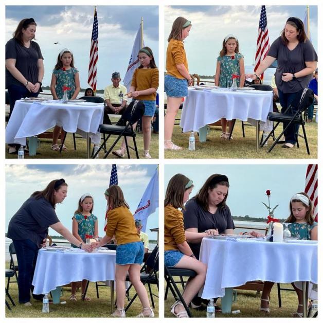 The program began with the 4th District Legion Riders, led by Jason Wolf Laughing, bringing in the POW/MIA flag and solemnly posting it beside Post 21 members Paul Bustos and Don Lucas, who portrayed soldiers still unaccounted for. The explanation of the POW/MIA table was reenacted by Ella and Millie Porter and their mom, Amanda, as they set the table for an evening meal without their missing loved one. They placed each piece carefully - the red rose, ribbon and vase, salt and lemon, the candle lighting the way home, a folded flag, the overturned glass, and the empty chair, as if one day he will return home to share the meal with them.