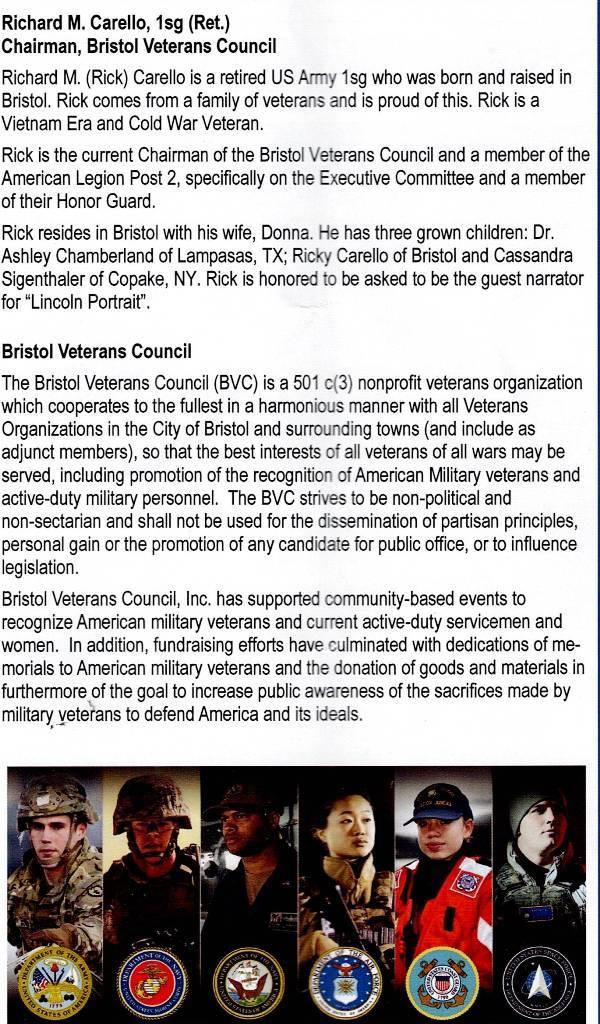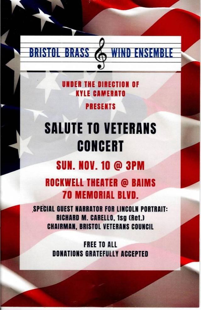 On Nov. 10 at 3 p.m. the Bristol Brass $ Wind Ensemble held a Veteran Concert at Rockwell Theater. The flags were placed for the start of the concert by the American Legion Post 2 Color Guard. The Bristol Veterans Council worked with the Bristol Brass & Wind Ensemble to organize the concert. Rite Carello, a member of Post 2 and chairman of the council, did the reading part in "Lincoln Portrait."