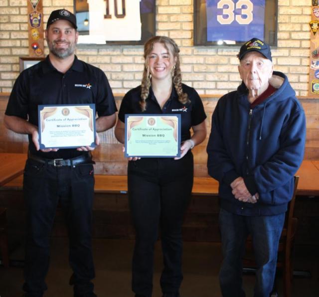 Afterwards Joe assisted American Legion Post 2, where he is an active member. With the post historian, they presented two certificates to Mission BBQ. One for hosting an Iwo Jima Remembrance Day event and the second for all the support they have given local veterans and their organizations this past year.