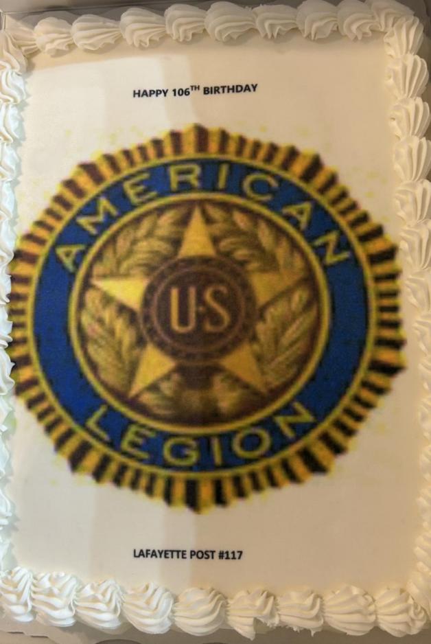 Macon County American Legion Post 117 celebrates The American Legion's 106th birthday with a newspaper article and birthday cake after their meeting.