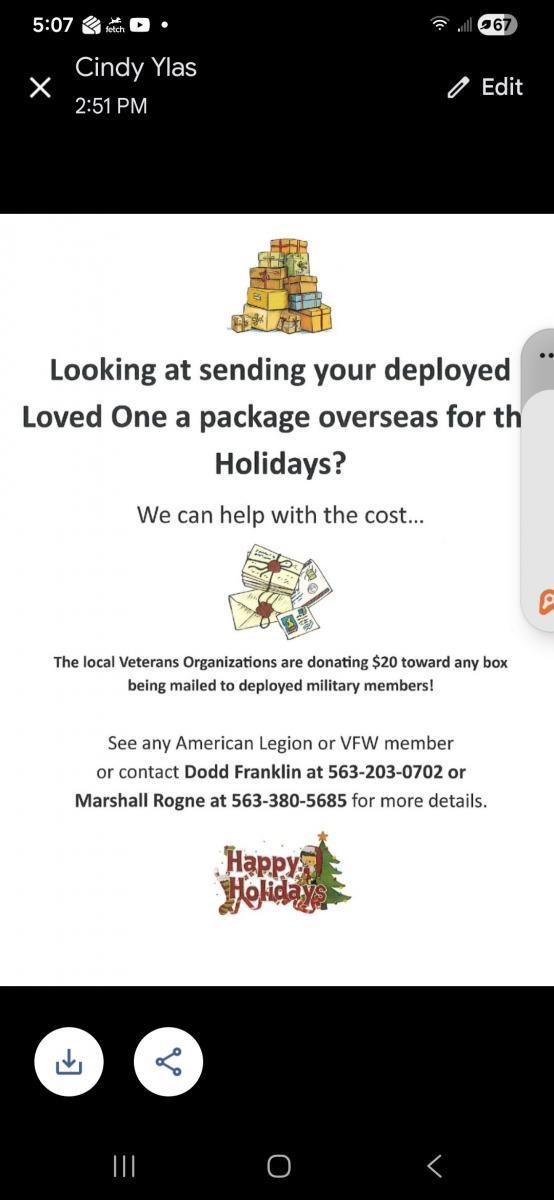 In August the Iowa NG was deployed to the Middle East. Post 135 began collecting donations and cash to ship boxes. Due to support from the veterans originations, businesses and citizens, we have shipped 34 flat rate boxes to 3 TF. In addition they requested wool blankets so we ordered 30 for $300 and then had to pay another $300 to ship 10. The post office temp raised rates during the holiday season, and we knew this might put extra hardship on families wanting to ship packages. So we took money from our postage fund and gave it to our veteran officer and told him to give $20 to anyone who showed they mailed a package to any servicemember, regardless if stateside or overseas. This helps any servicemember get a package for the holiday.