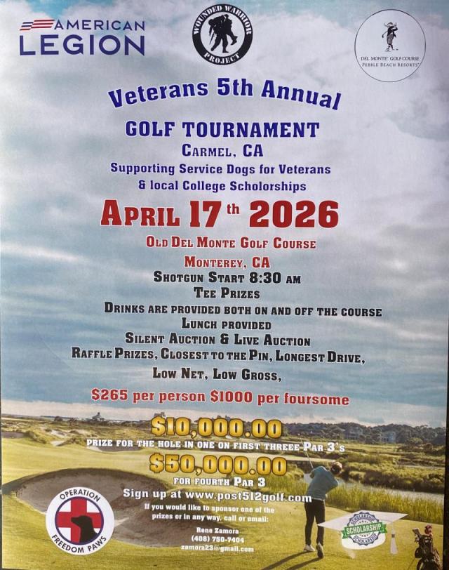 American Legion Post 512 of Carmel, Calif., is hosting its 5th Annual Golf Tournament on April 17, 2026, at Old Del Monte Golf Club in Monterey to support veterans through initiatives such as Service Dogs for Veterans, the Wounded Warriors Family Fund and scholarships. Since 2022, this tournament continues to be a vital fundraiser, having raised more than $200,000 in the past four years to benefit veterans and their families.