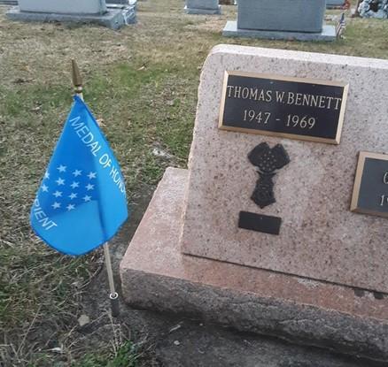 Morgantown native Thomas Bennett was awarded a posthumous Medal of Honor for his valor in Vietnam during the period of Feb. 9-11, 1969. He distinguished himself as a medic, repeatedly exposing himself to intense enemy fire to render lifesaving first aid to wounded soldiers and then carrying them to safety. Bennett was mortally wounded while attempting to reach a wounded soldier in a forward position under heavy enemy grazing fire.