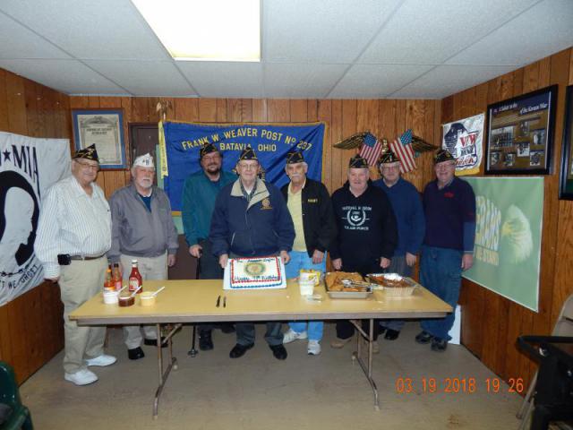 4th District of Ohio on March 19, 2018. The meeting was held at Post 237; we are the oldest charter in Clermont County and we were honored to have a 99th birthday party for The American Legion. We celebrated with a country favorite fried chicken strips, fried potato wedges, cole slaw, and of course a cake made by our local bakery. All veterans are welcome to join us going into our 100th year of The American Legion.