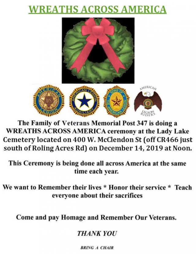 Squadron 347 in Lady Lake, Fla., hosted a Wreaths Across America ceremony at noon on Dec. 14, 2019, at Lady Lake Cemetery. They held a remembrance ceremony and then placed over 110 wreaths at veterans' gravesites. Mayor Jim Richards was guest speaker. The Post 347 Honor Guard, Legion, Auxiliary, Riders and Sons all participated in the ceremony.