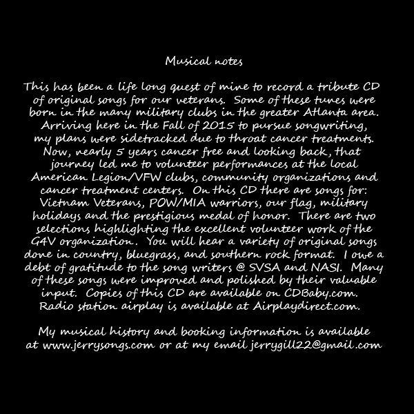 After serving 29+ years in the U.S. Navy, 12 of these years as leader and lead vocalist with the U.S. Navy Band's Country Current, I had written several songs for our servicemen and women. Many of these tunes are about their life, joys, victories, struggles and milestones. Now retired in the Atlanta area, I just recorded a CD titled "Songs For Veterans & Patriots." This CD has 10 original songs on subjects such as Memorial Day, Old Glory, Vietnam vets and The American Legion's famous 'Legacy Ride.' With a variety of genres including country, bluegrass and Southern rock, this CD is available for individual downloads (.99/song) or purchase the entire CD for $15 @ www.cdbaby.com. That includes shipping to your address. I'm sharing this music with our military audiences because these songs are about them and for them. Some of the lines in these songs came from conversations with veterans with PTSD and other issues. As a member of American Legion Post 127, many of these songs are performed live when I provide a couple of hours of entertainment at various Legions and VFWs in this area. Additionally, all of these songs, in their entirety, can be listened to at my website - www.jerrysongs.com. On this website there are other original songs on a variety of subjects - cancer survivors, love, life, old dogs and trains. All of my original tunes show up here for public enjoyment and audience evaluation. Additionally, press information and booking requests can be found there.