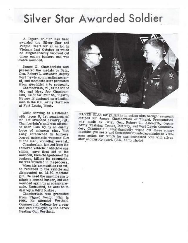 “While serving as a rifleman with troop B, 1st squadron of the 1st armored cavalry, Chamberlain’s unit was attacked near Tam Ky by an enemy force of unknown size. Viet Cong entrenched in bunkers poured automatic weapons fire at the men, wounding several.