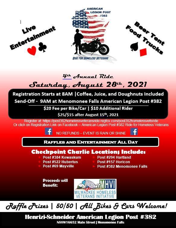 Please join us Saturday, Aug. 28, for the 4th Annual Ride for the Homeless Veterans and Community Block Party. All are welcome and encouraged, as we join to create awareness of this incredible cause. Over the last three years we have raised $30,000 for the Milwaukee Homeless Veterans Initiative.