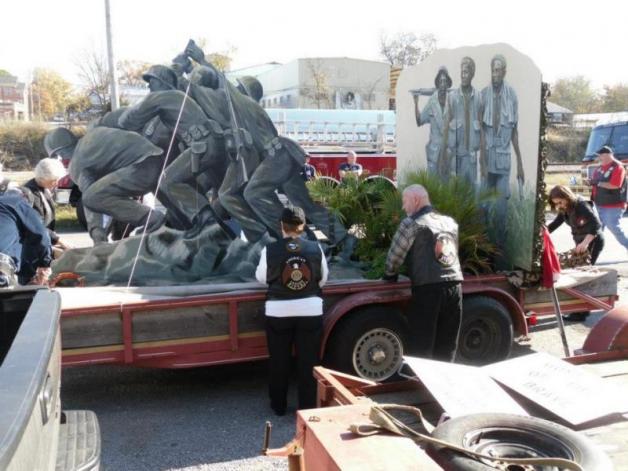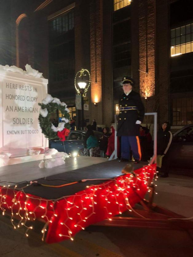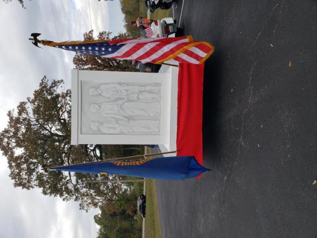 Over the ensuing years we represented different military themes on our floats. On each of the floats there has been a variety of family members and veterans. In 2011 our float not only displayed the hand-made flag, but we displayed several military uniforms on people and mannequins. In 2012 our theme was “Home of the Brave,” and we displayed two different wall-size paintings of the “Iwo Jima Memorial,” and the “Three Servicemen Memorial.” The float in 2013 saw us build a giant eagle under the theme of “All Gave Some – Some Gave All” honoring all veterans. In 2014 we displayed the twin towers from 9/11/01. In 2015 we honored female veterans with a float theme of the “Vietnam Women’s Memorial” as living statues. The ladies, Legionnaires and Auxiliary members, donned green camo paint to make them look like statues. The ladies rode the float during the parade completely still. They garnered several comments from the audience during the parade. Spectators could not believe that they were real people. Again in 2016 we had members ride the float as the soldiers honoring veterans as shown on the Korean Memorial, “The Forgotten War.” Post members, Legionnaires, Auxiliary, Sons and Riders were painted in silver makeup and carried rifles and radios. The float in 2017 saw us depict the Vietnam Wall Memorial again with live float riders. In 2018 we depicted the Tomb of the Unknown Soldier including a Legionnaire dressed as a member of the Old Guard guarding the tomb.