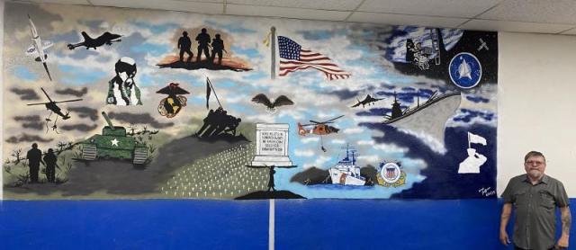 Our post home, now proudly standing for 130 years, has borne witness to generations of history and service. This year, we celebrated its enduring legacy with the completion of a new mural on the east wall. Artist Gene Hoffman, whose talent and dedication are well known in our community, completed this stunning work on Aug. 30, 2025 - less than a month after beginning. The mural beautifully honors our nation’s heroes, depicting three representations for each branch of the United States Military, along with a solemn tribute to the Tomb of the Unknown Soldier.