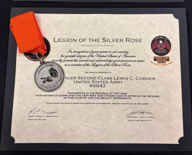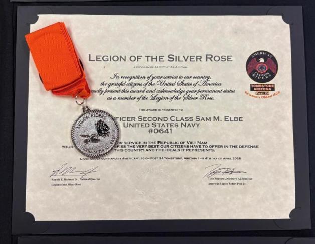 On April 4, the John J. Morris Post 62 (Peoria, Ariz.) Riders went to a ceremony to support two more of their members inducted into the Legion of the Silver Rose. This ceremony is for Vietnam veterans who suffer from Agent Orange. On this day, Sam Elbe and Lewis Corner, a Navy and Army veteran, were inducted along with 15 others. They join two previous honorees from the Post 62 Riders. It is a huge celebration honoring these veterans, with a classic car parade taking them around the area before the ceremony. The ceremony then honored them all individually prior to two posts making donations to the cause, including the largest donation of $1,500 from the Post 62 Riders. There was also a private donation in honor of a previous awardee who has passed away. Then everyone enjoyed a wonderful meal. A salute to all veterans honored at the event.