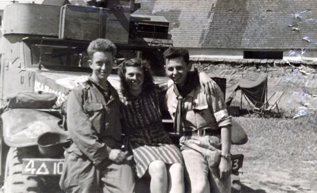 The three, a young boy in a Boy Scout uniform, a pretty girl in a striped dress, and an American GI wearing an expression of exhaustion, relief and happiness.
