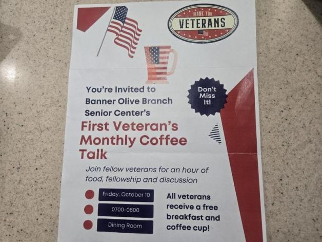 On Oct. 10, John J. Morris Post 62 (Peoria, Ariz.) had multiple members at Banner Olive Branch Senior Center's first veteran's monthly coffee talk. A great breakfast was donated to each veteran, and the turnout was over 90 veterans in attendance. The center was thrilled with the turnout. Post 62 was honored to be invited and support our local community. They will have monthly meetings going forward and took suggestions on who the veterans would like to have as speakers. We salute the senior center and their taking the first step to reach out to veterans in the community. Thank you!