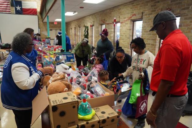 SAN ANTONIO – (Dec. 20, 2023) – Paul Harris (right), member of Fred Brock Sons of the American Legion Squadron 828, assist members of Alpha Pi Zeta Chapter of Zeta Phi Beta Sorority, Inc., wish distributing toys to children during the 45th Annual Claude W. Black Community Center Holiday Gift Giveaway. (Photo by Post Commander Burrell Parmer/828)
