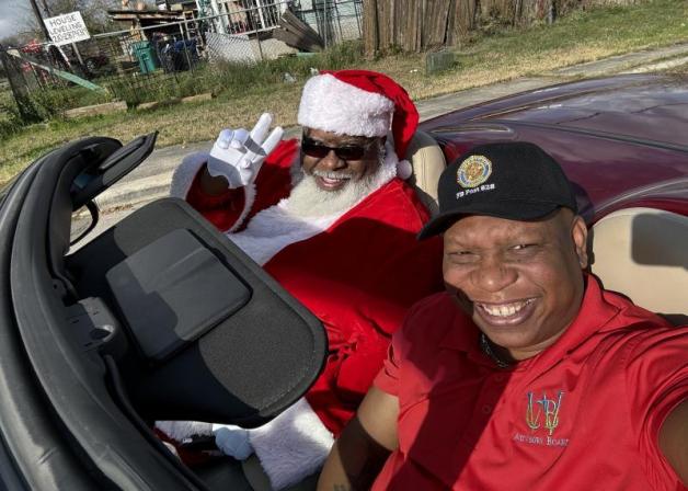 SAN ANTONIO – (Dec. 20, 2023) – Post Commander Burrell Parmer of Fred Brock American Legion Post 828 gives Santa a ride to the 45th Annual Claude W. Black Community Center Holiday Gift Giveaway. (Photo by Post Commander Burrell Parmer/828)