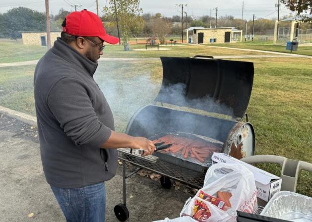 SAN ANTONIO – (Dec. 20, 2023) – Legionnaire Tavarus Glover of Fred Brock American Legion Post 828 grilled hotdogs for families attending the 45th Annual Claude W. Black Community Center Holiday Gift Giveaway. Glover, an Air Force Veteran, also serves as president of the CWB Advisory Board. (Photo by Post Commander Burrell Parmer/828)