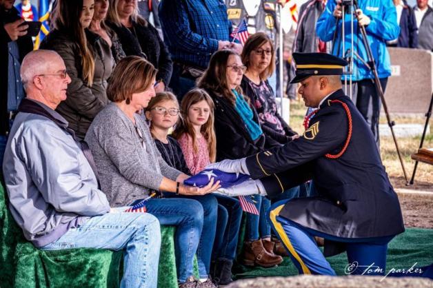 On Saturday, Nov. 20, the motorcade pulled into the cemetery and came to a halt. An almost preternatural silence fell as family members assembled in the tent. Following a short service, an officer presented the flag to Colleen Behrens, one of Herynk’s great-nieces.