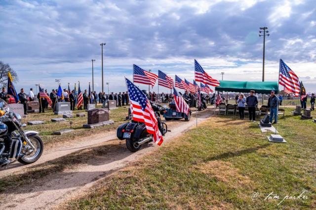 A collective ripple of anticipation stirred the crowd clustered around an open-walled tent in St. John’s Catholic Cemetery in Hanover. Dozens of VFW honor guard members and military personnel snapped to their respective positions, rank upon uniformed rank, their flags and banners furling and unfurling in the breeze. Bystanders gravitated toward the fence for a better view of the approaching motorcade. Off to the side, a WIBW reporter swiveled her video camera toward an entrance lane bordered with flags.